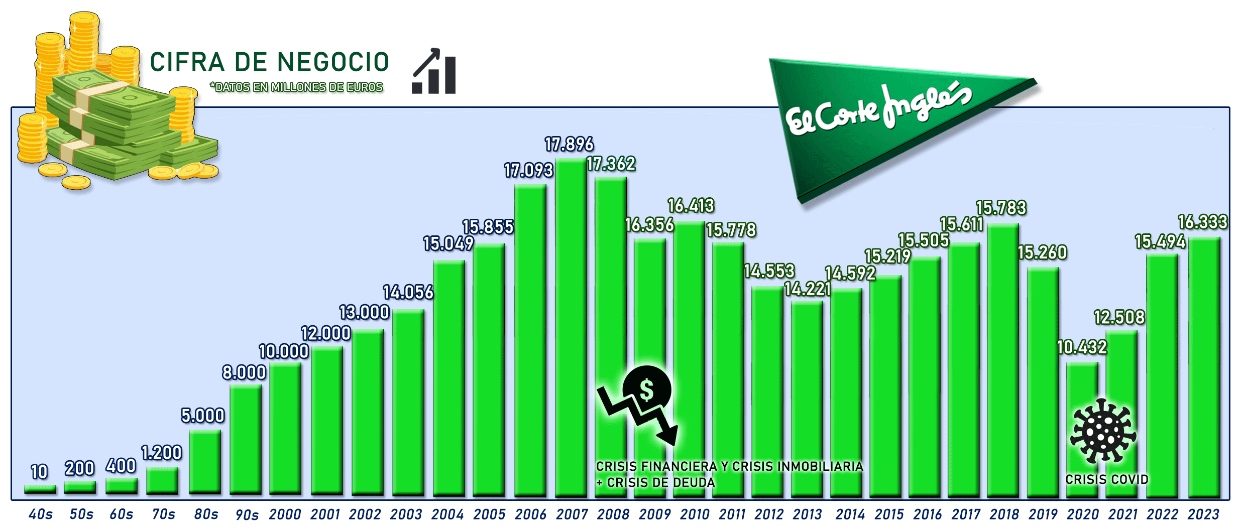 pero que en su momento de máxima expansión (2010´s) rozaría los 100 grandes almacenes, contando con una plantilla de más de 100.000 trabajadores (posicionándose durante muchos años como la principal empresa privada empleadora de España, si bien, tras los planes de saneamiento se reduciría a algo más de 80.000),