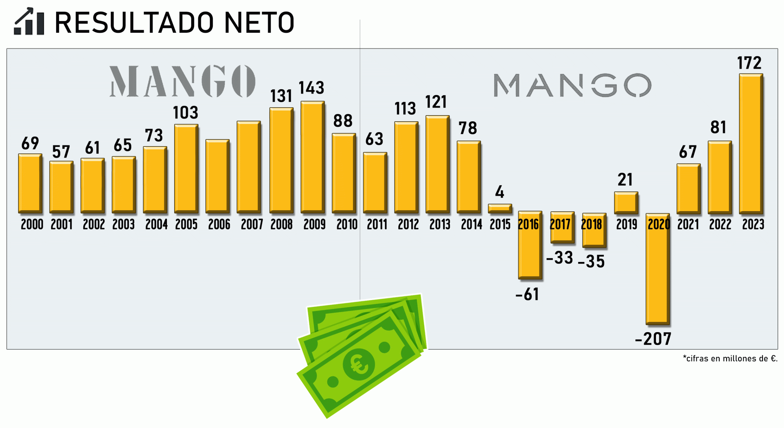 (2) A mayores, este intento de reposicionamiento coincidiría con el estallido de la profunda crisis financiera mundial de 2008, la cual provocaría una fuerte contracción del consumo en casi todos los países, afectando también a las tiendas de Mango (a pesar de su elevado grado de diversificación internacional).
